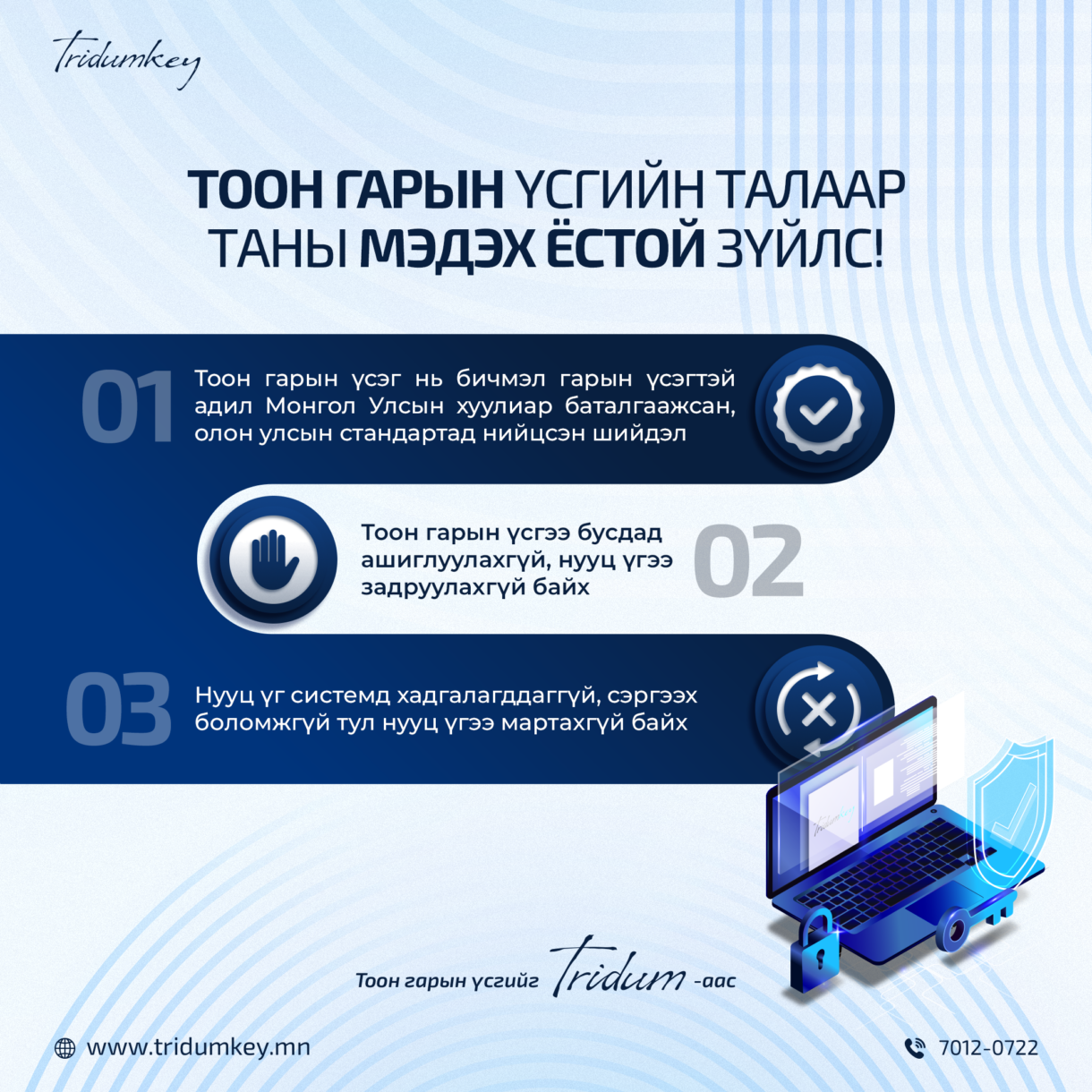 Та тоон гарын үсэг авахад олон шат дамжлага, төвөгтэй процесс шаардлагатай гэж бодож байна уу? Үнэндээ шаардлагатай бичиг баримтаа бүрдүүлснээр та богино хугацаанд тоон гарын үсэгтэй болж, байгууллагад зориулсан цахим үйлчилгээг авах боломжтой. Тоон гарын үсэг авахад ямар бичиг баримт бүрдүүлэх шаардлагатай талаар дэлгэрэнгүй мэдээлэл болон албан бичгийн загвар харах бол Бүрдүүлбэр холбоос дээр дарна […]